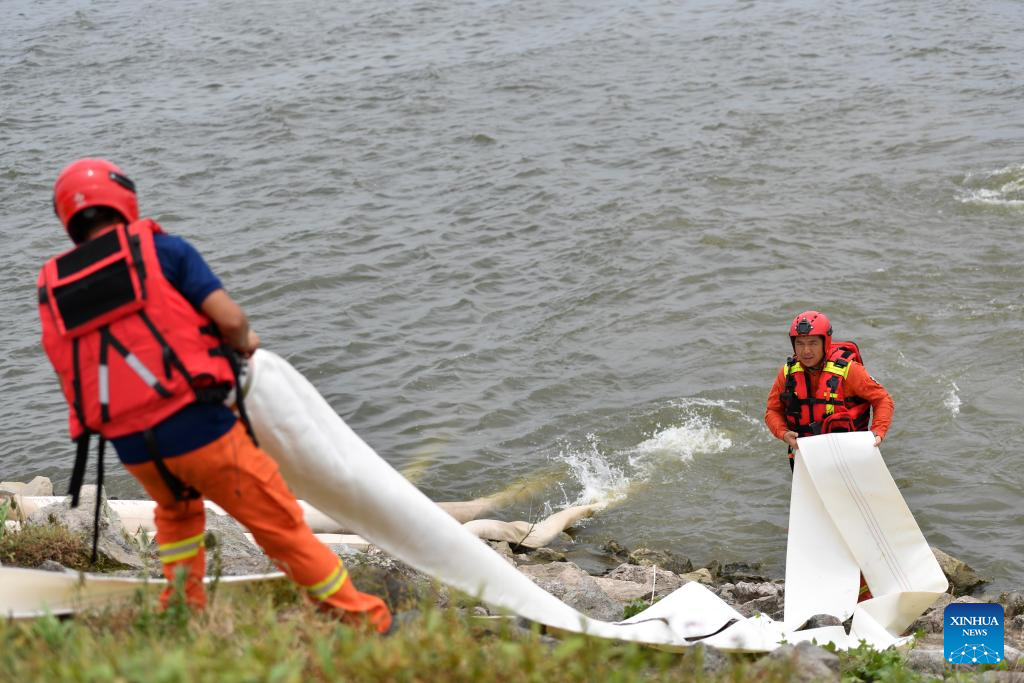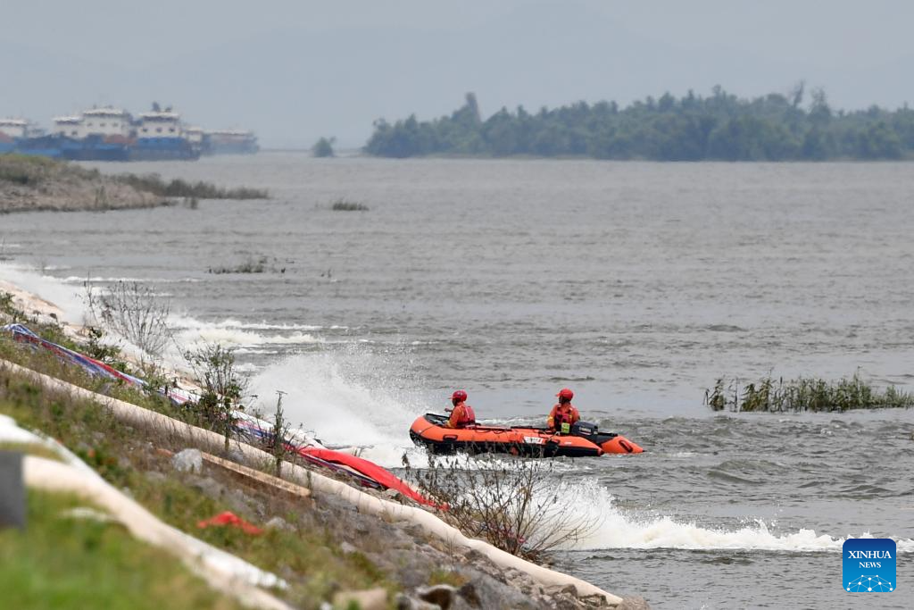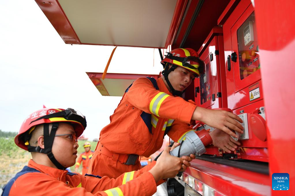 Rescuers prepare to drain floodwater at a Dongting Lake dike in Tuanzhou Township, Huarong County under Yueyang City, central China's Hunan Province, July 9, 2024. The breach in the dike was successfully sealed late on Monday and work to drain flooded land and reduce risks are ongoing, according to authorities. (Xinhua/Chen Zhenhai)