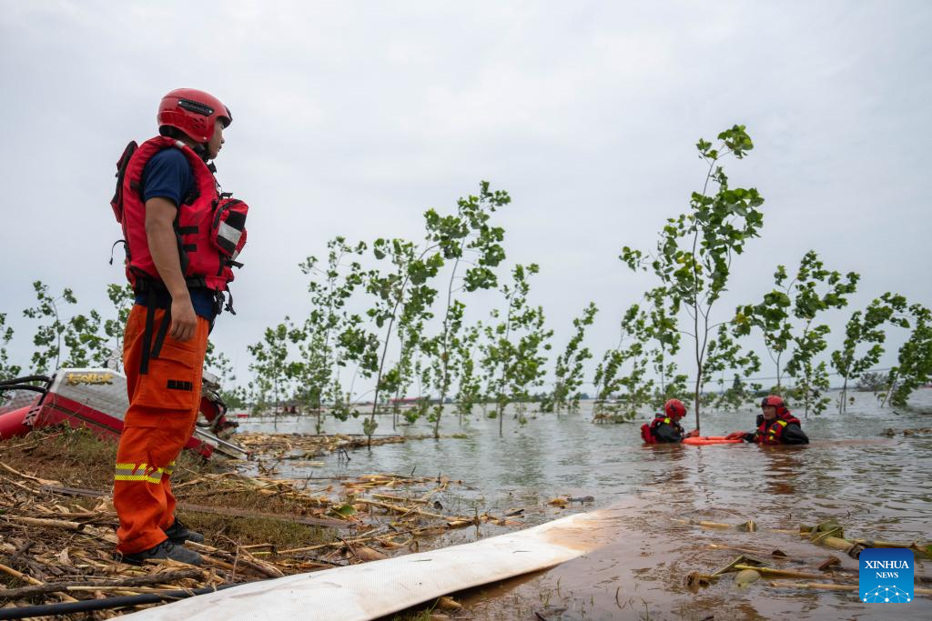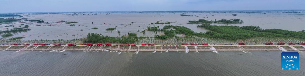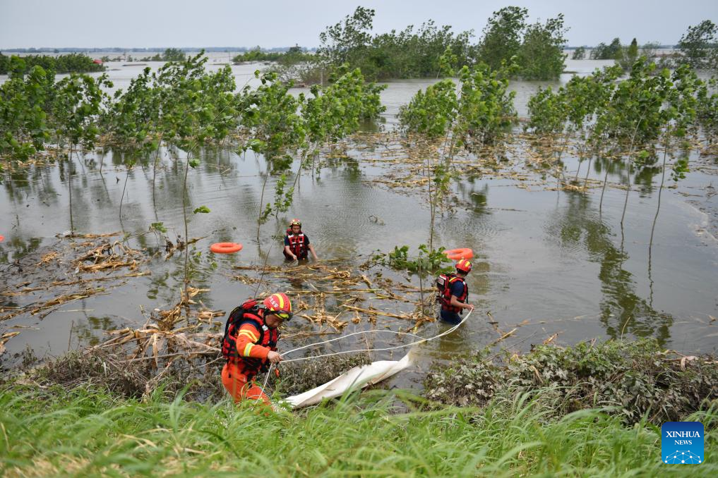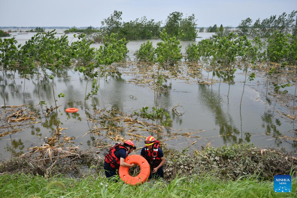 Rescuers drain floodwater at a Dongting Lake dike in Tuanzhou Township, Huarong County under Yueyang City, central China's Hunan Province, July 9, 2024. The breach in the dike was successfully sealed late on Monday and work to drain flooded land and reduce risks are ongoing, according to authorities. (Xinhua/Chen Zhenhai)