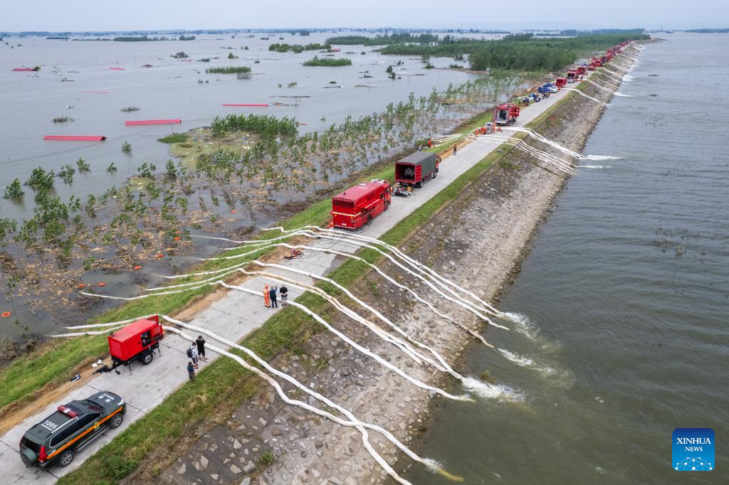 Rescuers prepare to drain floodwater at a Dongting Lake dike in Tuanzhou Township, Huarong County under Yueyang City, central China's Hunan Province, July 9, 2024. The breach in the dike was successfully sealed late on Monday and work to drain flooded land and reduce risks are ongoing, according to authorities. (Xinhua/Chen Sihan)