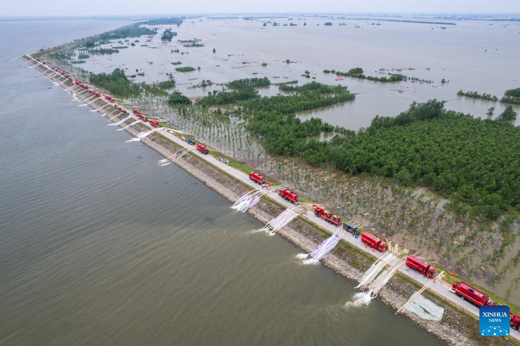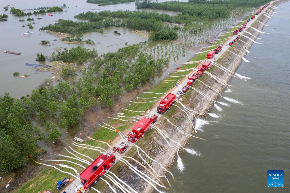 Rescuers drain floodwater at a Dongting Lake dike in Tuanzhou Township, Huarong County under Yueyang City, central China's Hunan Province, July 9, 2024. The breach in the dike was successfully sealed late on Monday and work to drain flooded land and reduce risks are ongoing, according to authorities. (Xinhua/Chen Sihan)