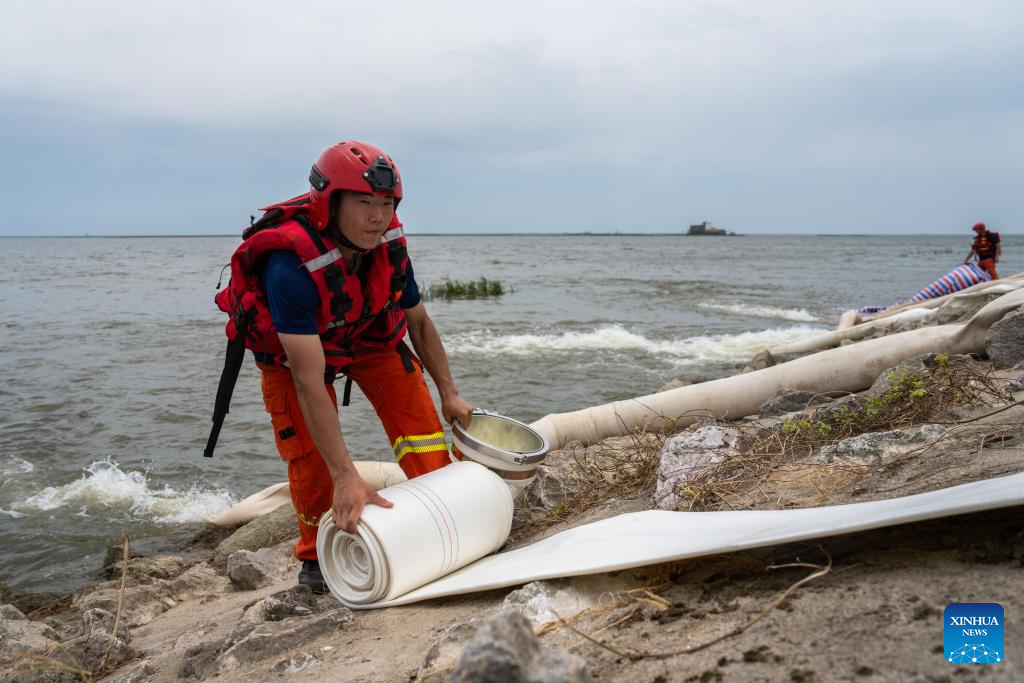 A rescuer prepares to drain floodwater at a Dongting Lake dike in Tuanzhou Township, Huarong County under Yueyang City, central China's Hunan Province, July 9, 2024. The breach in the dike was successfully sealed late on Monday and work to drain flooded land and reduce risks are ongoing, according to authorities. (Xinhua/Chen Sihan)