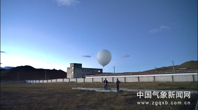 9月10日7时15分,海拔4706米的西藏自治区班戈国家基本气象观测站成功施放首个北斗导航探空气球。图片来源:中国气象报社