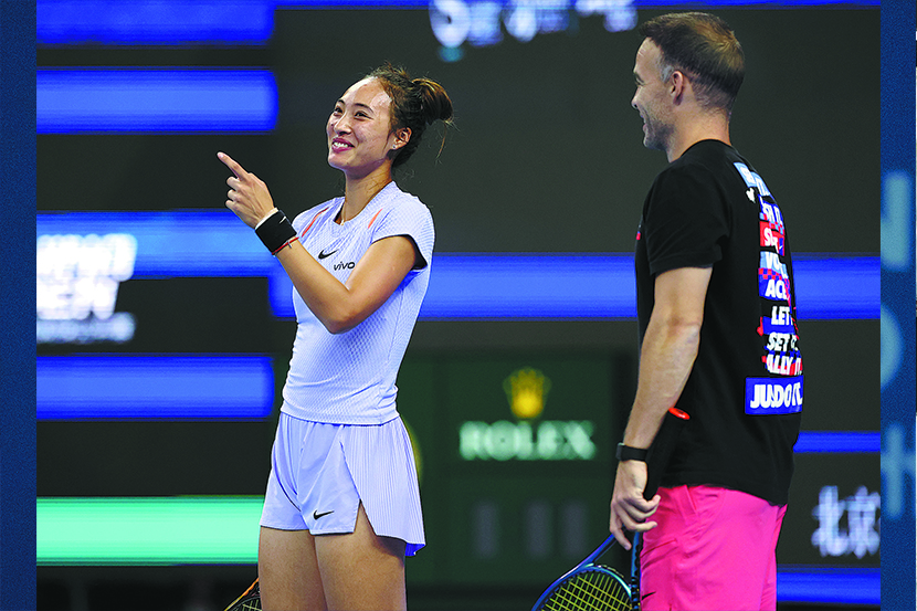 Olympic champion and world No 7 Zheng Qinwen of China enjoys a light moment with her coach during a practice session for the China Open on Tuesday.XINHUA