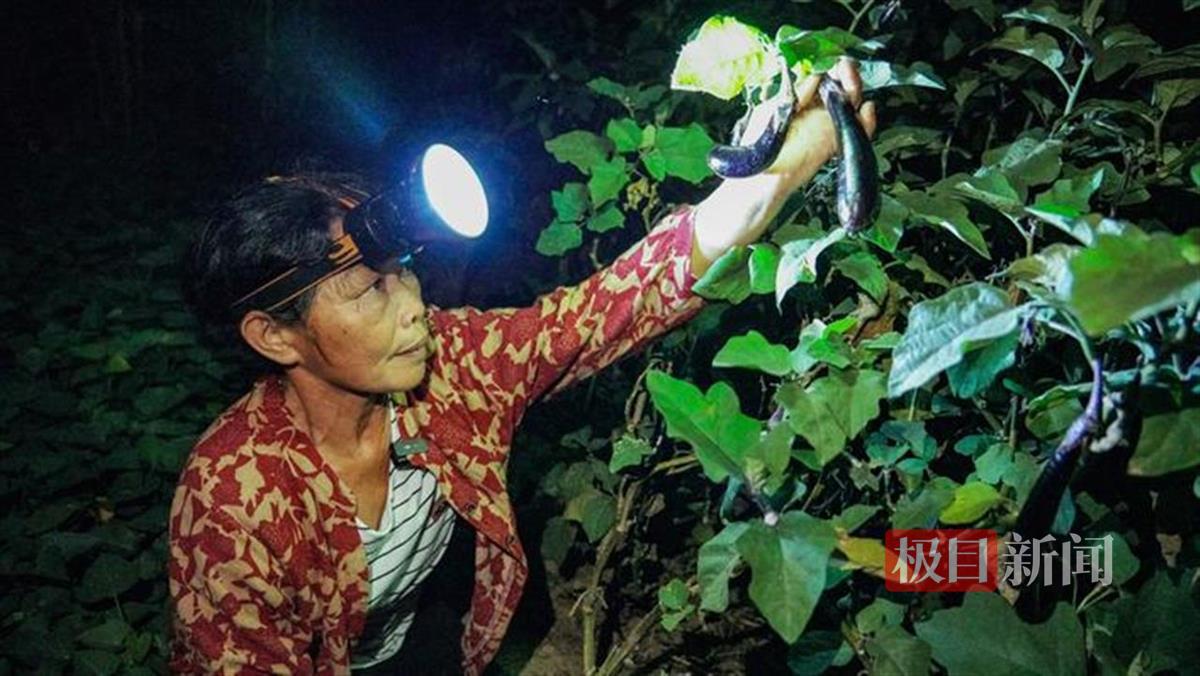 学珍戴着头灯采摘新鲜蔬菜(Luo Xuezhen wears a headlamp to harvest fresh vegetables)