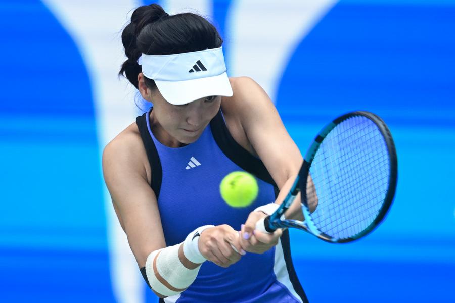 Wang Xinyu hits a return during her women's singles quarterfinal victory against Ekaterina Alexandrova at the 2024 Wuhan Open in Wuhan, Hubei Province, Oct. 11, 2024. (Xinhua/Du Zixuan)