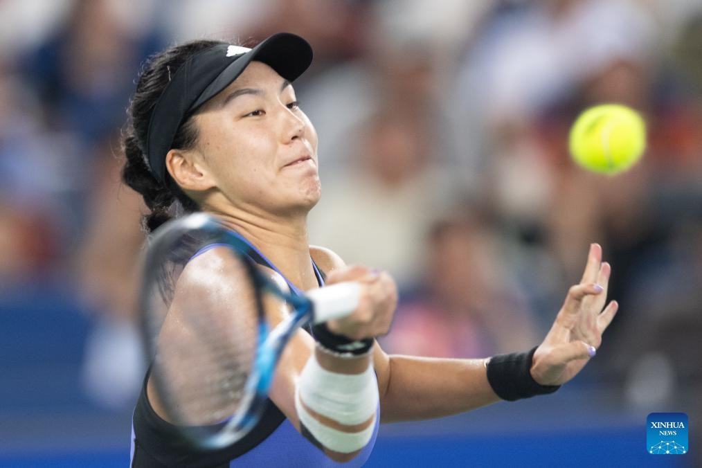 Wang Xinyu hits a return during the women's singles semifinal match between Zheng Qinwen of China and Wang Xinyu of China at the 2024 Wuhan Open tennis tournament in Wuhan, central China's Hubei Province, Oct. 12, 2024. (Xinhua/Xiao Yijiu)