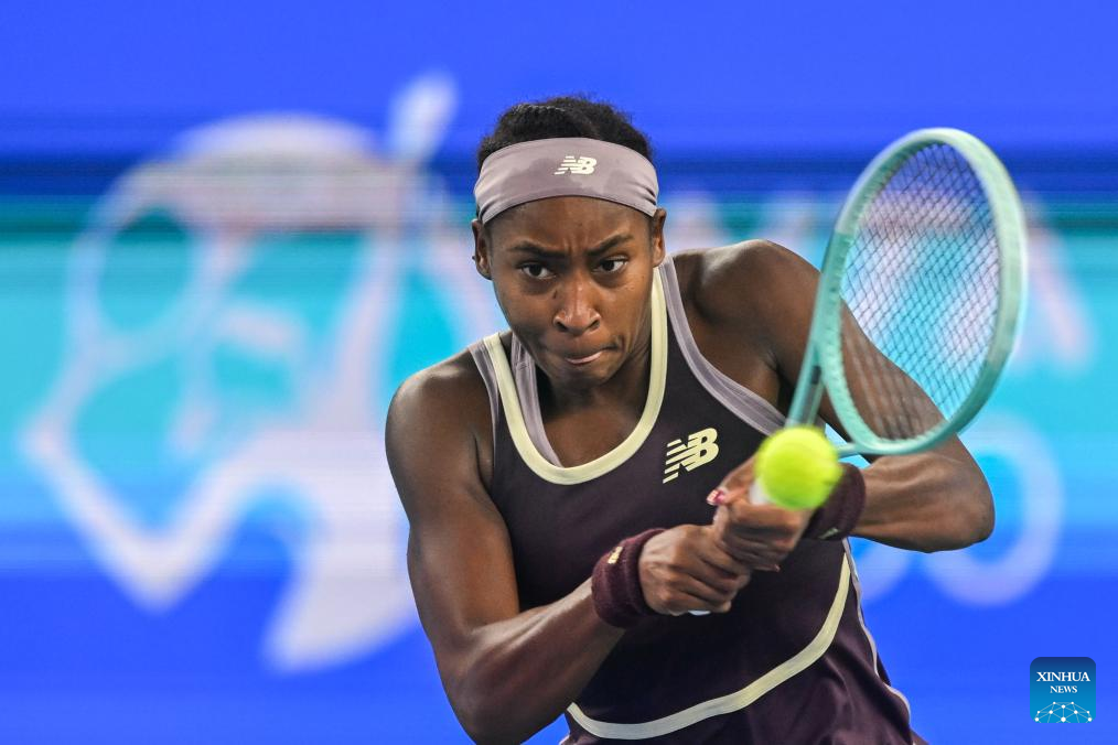 Coco Gauff hits a return during the women's singles semifinal match between Aryna Sabalenka of Belarus and Coco Gauff of the United States at the 2024 Wuhan Open tennis tournament in Wuhan, central China's Hubei Province, Oct. 12, 2024. (Xinhua/Du Zixuan)