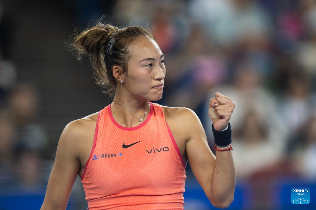 Zheng Qinwen celebrates during the women's singles semifinal match between Zheng Qinwen of China and Wang Xinyu of China at the 2024 Wuhan Open tennis tournament in Wuhan, central China's Hubei Province, Oct. 12, 2024. (Xinhua/Xiao Yijiu)