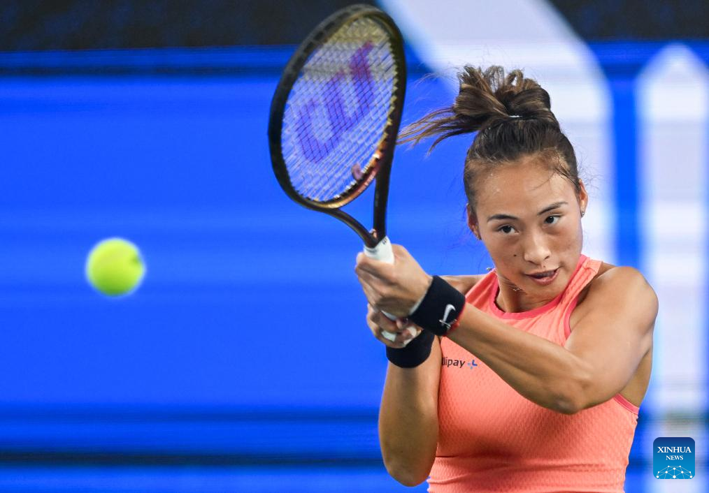 Zheng Qinwen hits a return during the women's singles semifinal match between Zheng Qinwen of China and Wang Xinyu of China at the 2024 Wuhan Open tennis tournament in Wuhan, central China's Hubei Province, Oct. 12, 2024. (Xinhua/Du Zixuan)