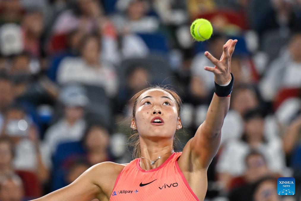 Zheng Qinwen serves during the women's singles semifinal match between Zheng Qinwen of China and Wang Xinyu of China at the 2024 Wuhan Open tennis tournament in Wuhan, central China's Hubei Province, Oct. 12, 2024. (Xinhua/Du Zixuan)