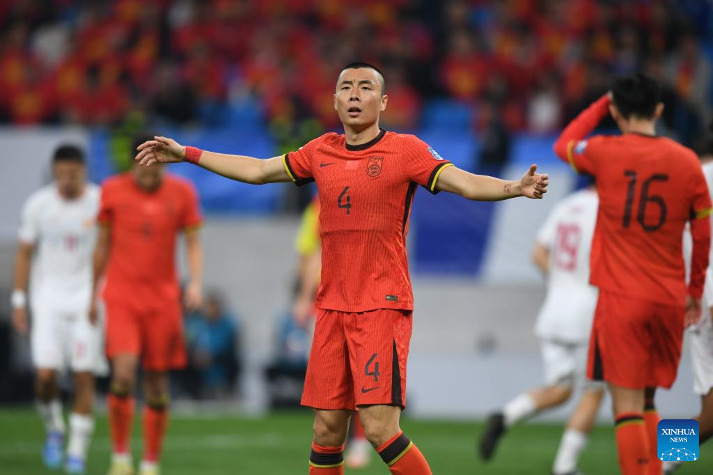 Li Lei of China reacts during the 2026 FIFA World Cup Asian Qualifiers Group C match between China and Indonesia in Qingdao, east China's Shandong Province, Oct. 15, 2024. (Xinhua/Li Ziheng)