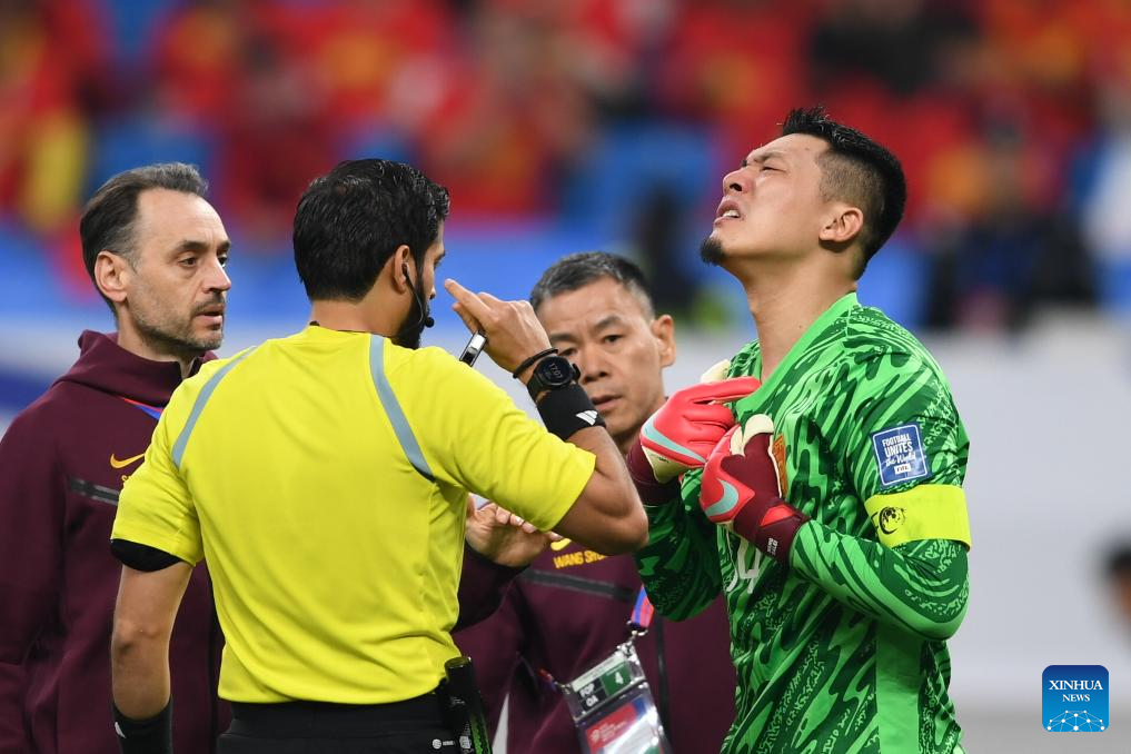 Goalkeeper Wang Dalei (R) of China gestures during the 2026 FIFA World Cup Asian Qualifiers Group C match between China and Indonesia in Qingdao, east China's Shandong Province, Oct. 15, 2024. (Xinhua/Li Ziheng)
