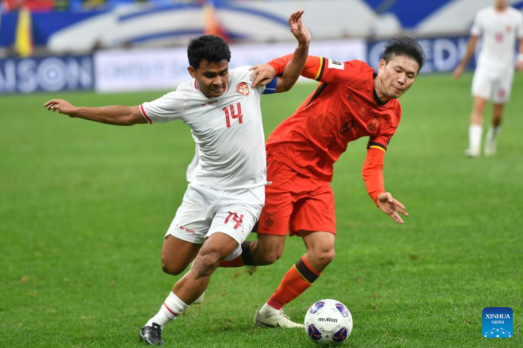 Li Yuanyi (R) of China vies with Marselino Ferdinan of Indonesia during the 2026 FIFA World Cup Asian Qualifiers Group C match in Qingdao, east China's Shandong Province, Oct. 15, 2024. (Xinhua/Li Ziheng)
