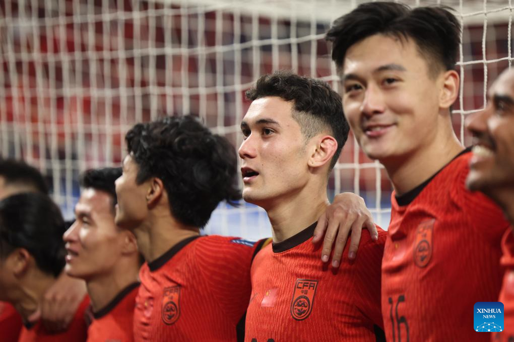 Baihelamu Abuduwaili (3rd R) of China celebrates after the 2026 FIFA World Cup Asian Qualifiers Group C match between China and Indonesia in Qingdao, east China's Shandong Province, Oct. 15, 2024. (Xinhua/Jia Haocheng)