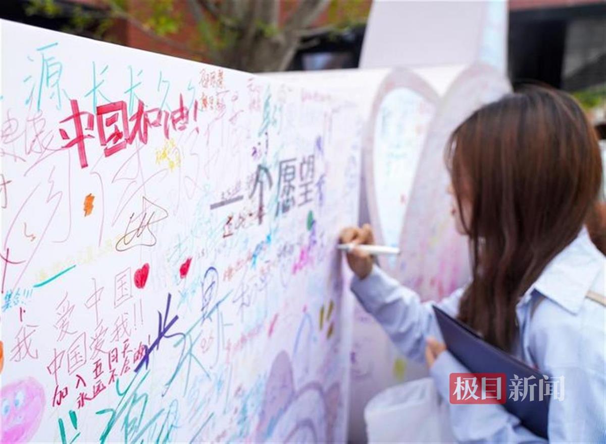 记者看到,这里人气最旺的,当属老建筑前的打卡墙了。人们纷纷驻足墙前,用最真挚的语言写下对祖国母亲的祝福。有的写下“愿我的祖国永远强大”,寄托了对国家光辉前景的热切向往;有的则简洁直白地写下“我爱你,中国”,字里行间流露出对这片土地深沉的爱恋与颂扬。