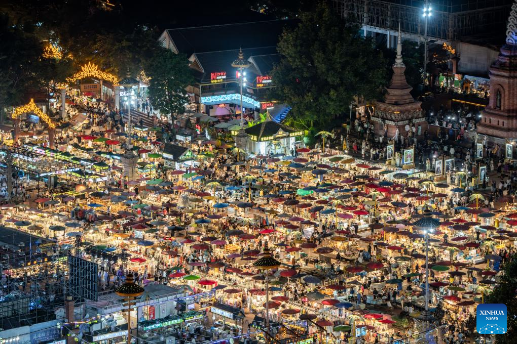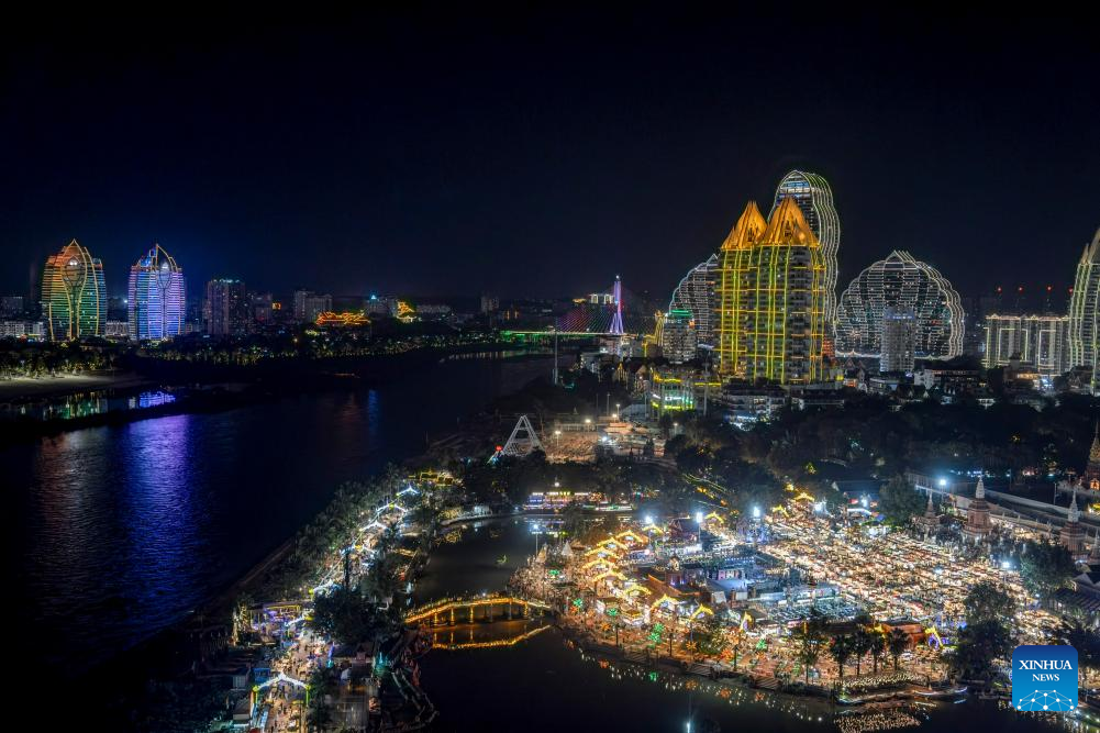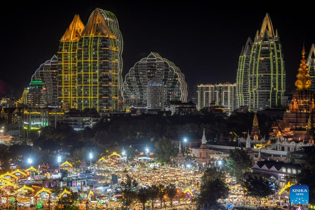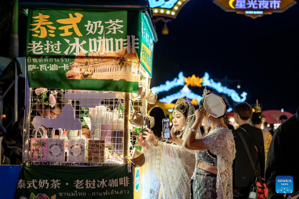 This photo shows a view of the Starlight Night Market in Jinghong City of Xishuangbanna Dai Autonomous Prefecture, southwest China's Yunnan Province, Dec. 7, 2024. The night market is a destination to experience the customs of Dai ethnic group. (Xinhua/Hu Chao)