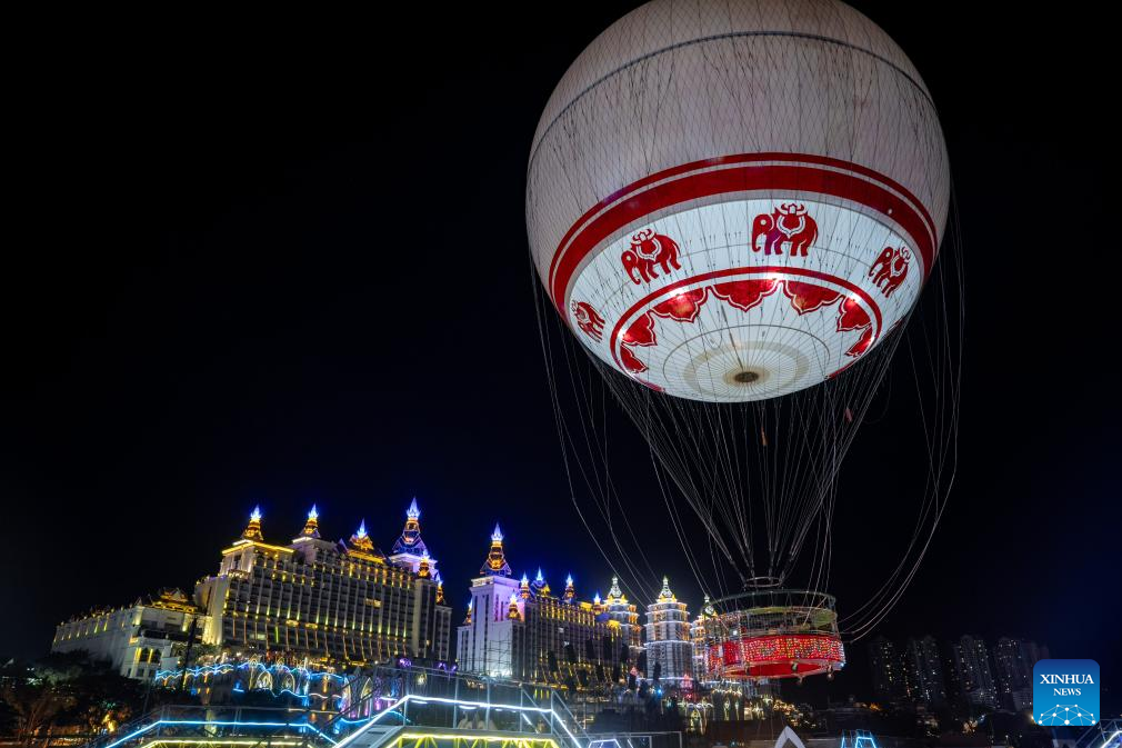 Tourists take a ride on a hot air balloon at the Starlight Night Market in Jinghong City of Xishuangbanna Dai Autonomous Prefecture, southwest China's Yunnan Province, Dec. 7, 2024. The night market is a destination to experience the customs of Dai ethnic group. (Xinhua/Hu Chao)