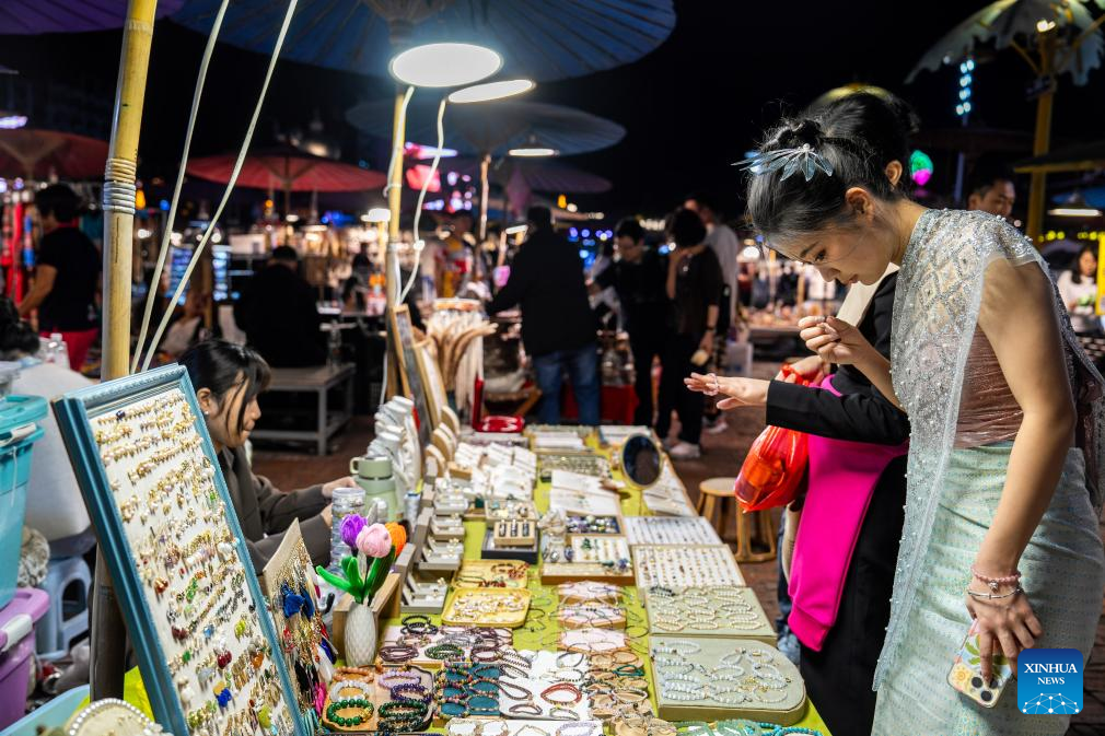 Tourists visit the Starlight Night Market in Jinghong City of Xishuangbanna Dai Autonomous Prefecture, southwest China's Yunnan Province, Dec. 7, 2024. The night market is a destination to experience the customs of Dai ethnic group. (Xinhua/Hu Chao)