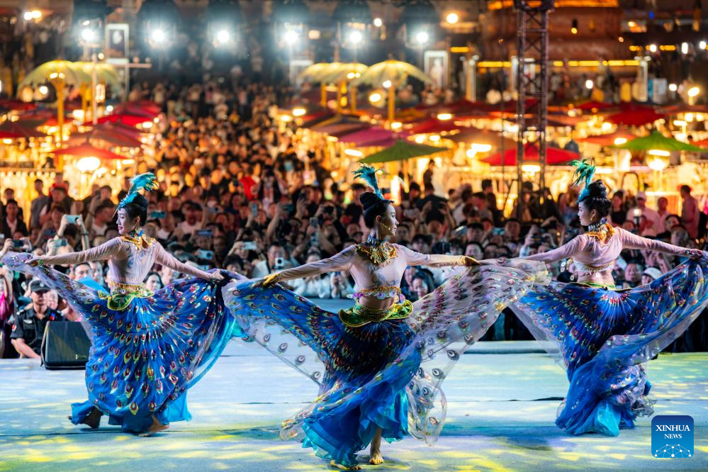Tourists watch a performance at the Starlight Night Market in Jinghong City of Xishuangbanna Dai Autonomous Prefecture, southwest China's Yunnan Province, Dec. 7, 2024. The night market is a destination to experience the customs of Dai ethnic group. (Xinhua/Hu Chao)