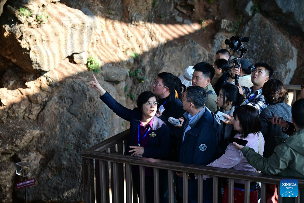 International experts attending the Hualongdong site academic conference visit the exhibition hall of the Hualongdong site in Dongzhi County of Chizhou City, east China's Anhui Province, Dec. 6, 2024. (Xinhua/Zhou Mu)