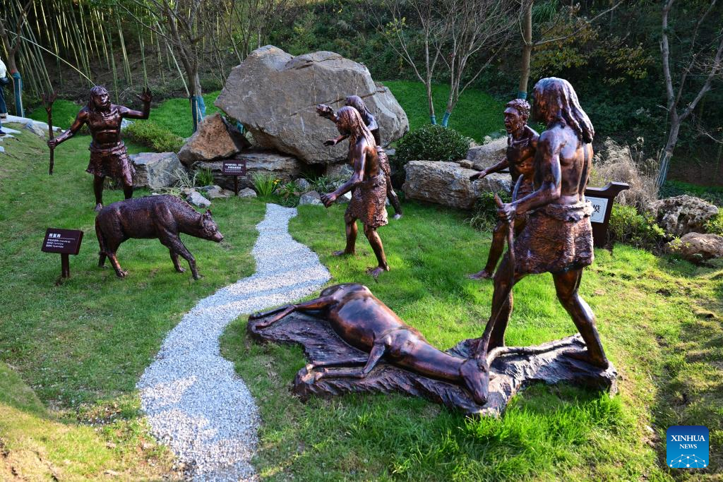 This photo taken on Dec. 6, 2024 shows a re-enactment of an ancient human hunting scene at Hualongdong site in Dongzhi County of Chizhou City, east China's Anhui Province. (Xinhua/Zhou Mu)
