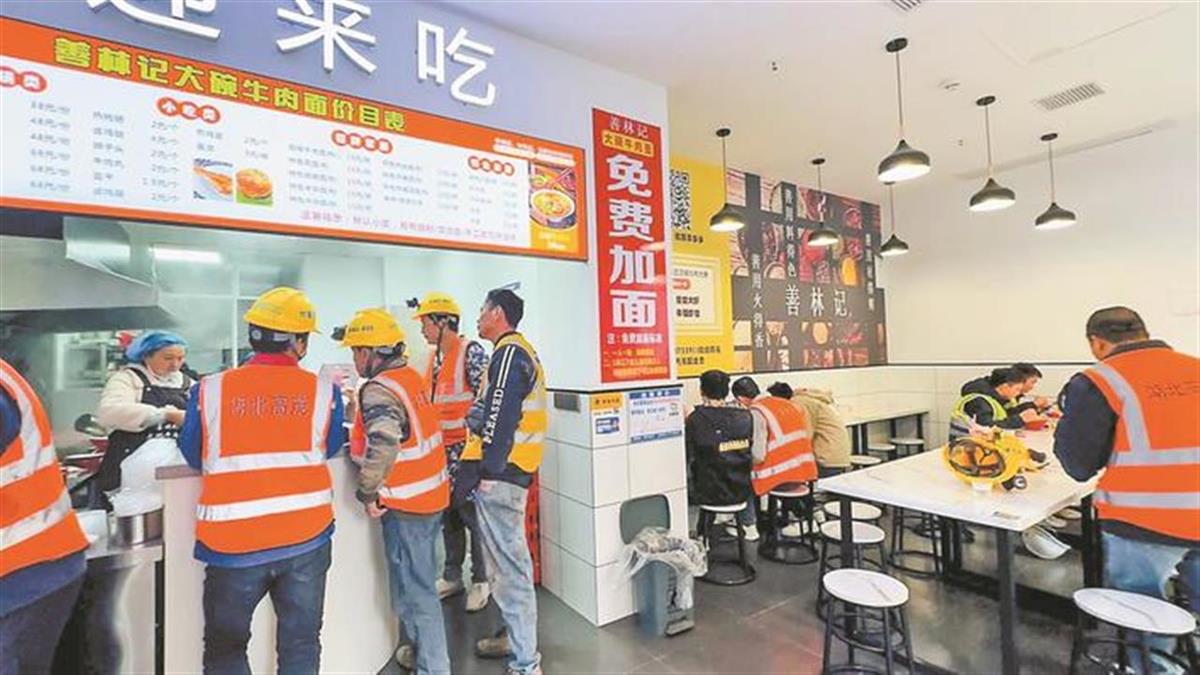 临近中午,店内坐满吃面的顾客,许多都是附近工地干活的工人。墙上的一张海报上还写着:一人一碗,免费续面。