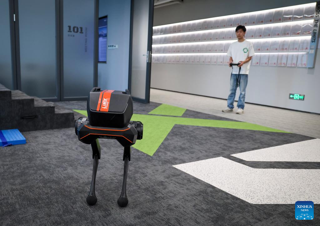 A staff member demonstrates the walking ability of a TRON1 bipedal robot at a sci-tech company in Shenzhen, south China's Guangdong Province, Dec. 6, 2024. The Guangdong-Hong Kong-Macao Greater Bay Area, with its outstanding capabilities in research and development and solid foundation for manufacturing, serves as a fertile ground for the development of humanoid robot sector.