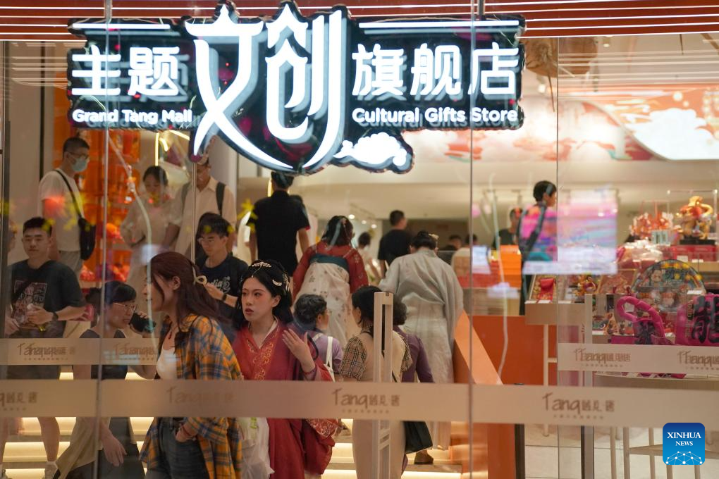 Tourists shop at a cultural gifts store of the Grand Tang Mall, a Tang Dynasty-themed pedestrian area, in Xi'an, northwest China's Shaanxi Province, May 20, 2024.