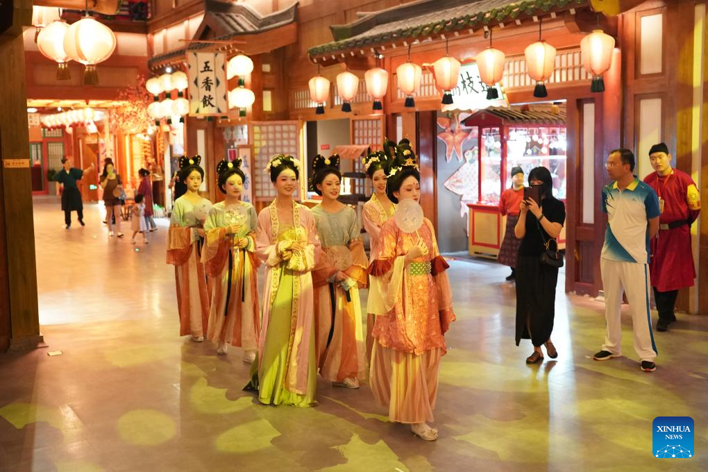 Tourists watch a performance at the Grand Tang Mall, a Tang Dynasty-themed pedestrian area, in Xi'an, northwest China's Shaanxi Province, May 20, 2024.