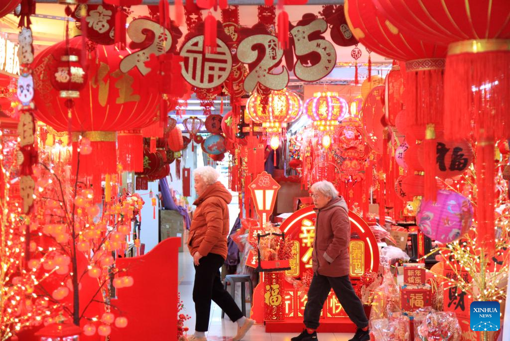 Customers buy festive decorations at a market in Nanjing, east China's Jiangsu Province, Dec. 29, 2024. China is gearing up for the upcoming New Year 2025 with festive decorations and various activities nationwide. (Photo by Liu Jianhua/Xinhua)