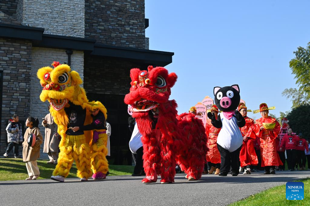 Villagers take part in a folk art performance in Maowu Village of Daixi Town, Wuxing District, Huzhou, east China's Zhejiang Province, Dec. 28, 2024. China is gearing up for the upcoming New Year 2025 with festive decorations and various activities nationwide. (Photo by He Weiwei/Xinhua)