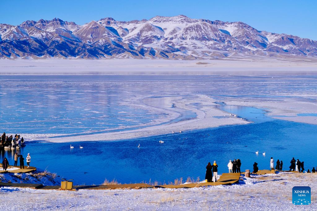 Tourists visit Sayram Lake in Bortala Mongolian Autonomous Prefecture, northwest China's Xinjiang Uygur Autonomous Region, Jan. 14, 2025. (Xinhua/Du Juanjuan)