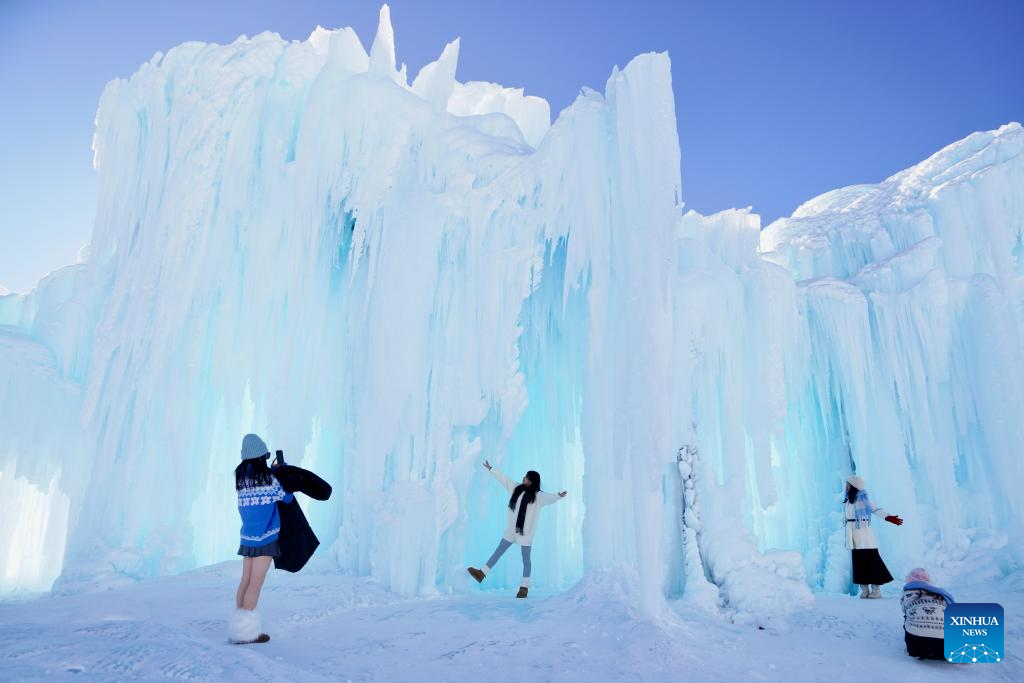 Tourists take photos in front of a frozen waterfall at Sayram Lake in Bortala Mongolian Autonomous Prefecture, northwest China's Xinjiang Uygur Autonomous Region, Jan. 14, 2025. (Xinhua/Du Juanjuan)