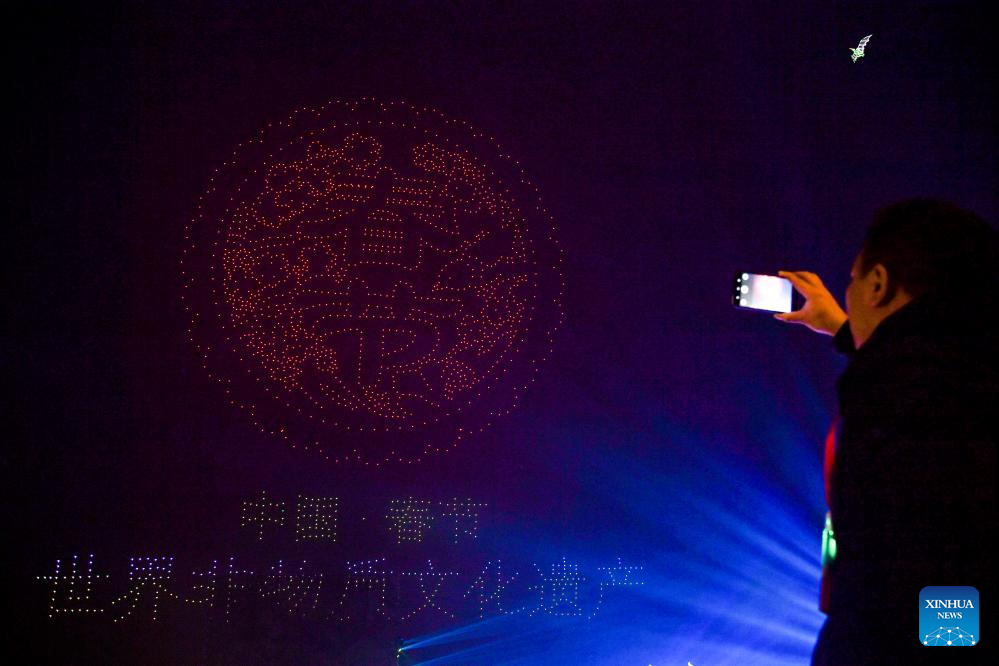 A tourist views a drone show during the 31st Zigong International Dinosaur Lantern Show in Zigong, southwest China's Sichuan Province, Jan. 17, 2025. The 31st Zigong International Dinosaur Lantern Show kicked off here on Friday. This year's lantern show features 12 groups of super-large light sets, seven groups of large light sets and more than 200 groups of small and medium-sized light sets. The scale of the lantern displays has set a new record in the history of the Zigong International Dinosaur Lantern Show. (Xinhua/Wang Xi)