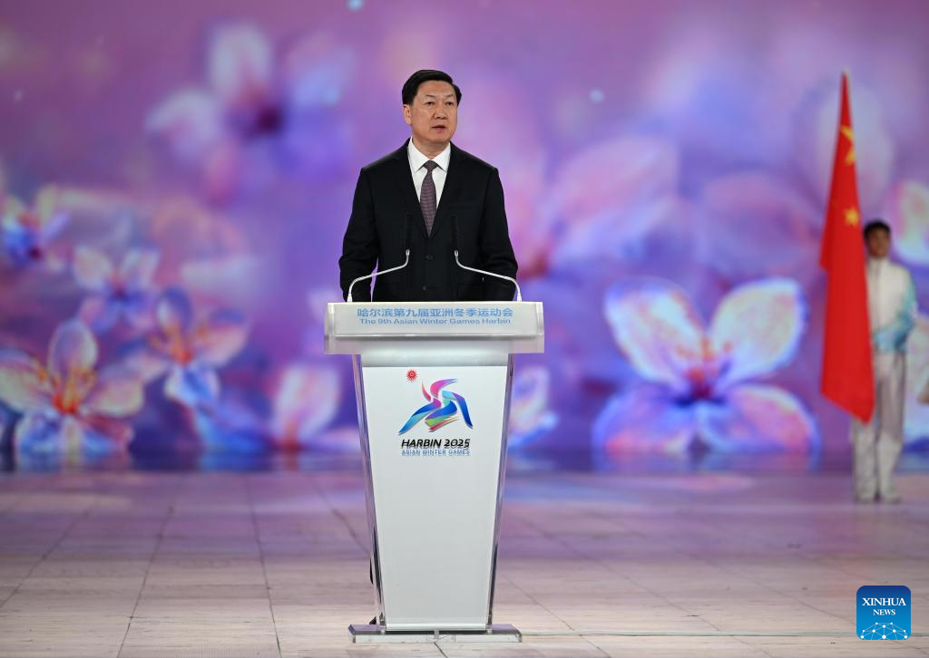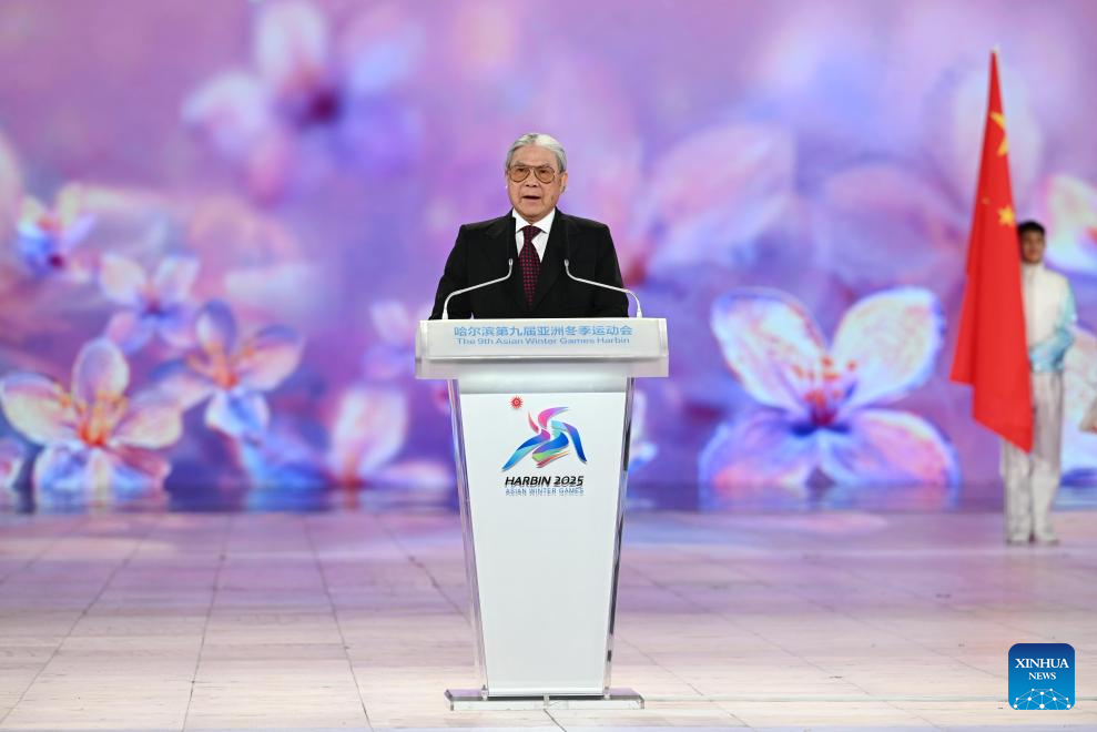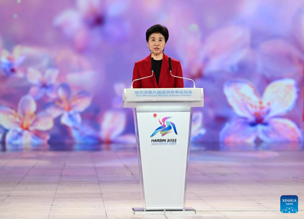 Gao Zhidan, president of the 9th Asian Winter Games Harbin Organising Committee and the Chinese Olympic Committee, speaks during the opening ceremony of the 9th Asian Winter Games in Harbin, northeast China's Heilongjiang Province, Feb. 7, 2025. (Xinhua/Xie Jianfei)