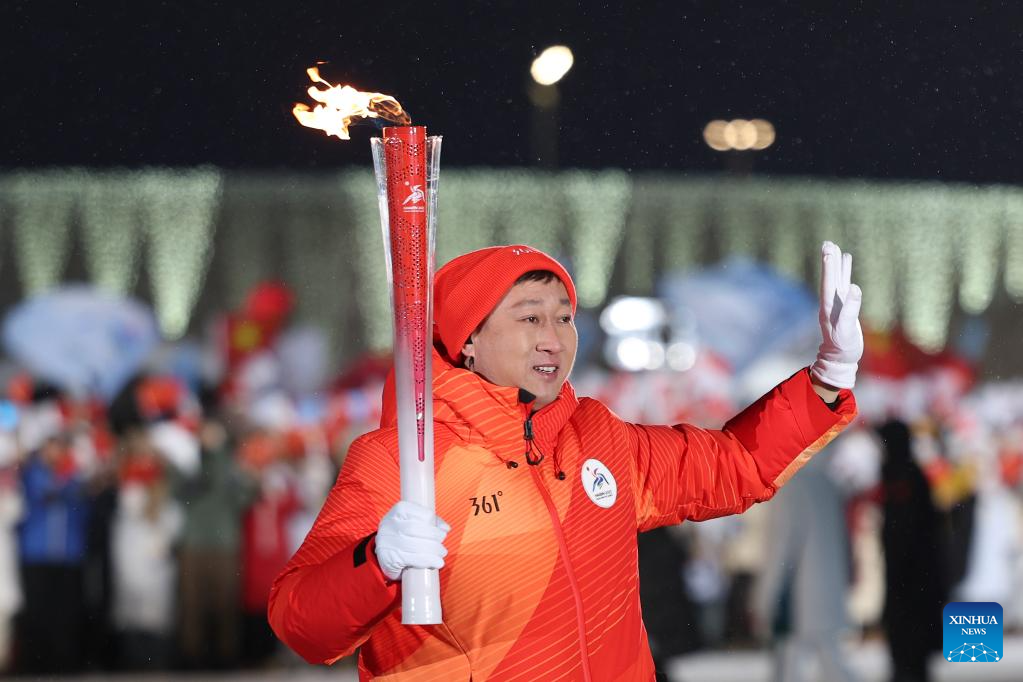 Torch bearer Wang Zhen carries the flame at the Harbin Ice and Snow World Park during the opening ceremony of the 9th Asian Winter Games in Harbin, northeast China's Heilongjiang Province, Feb. 7, 2025. (Xinhua/Hu Xingyu)