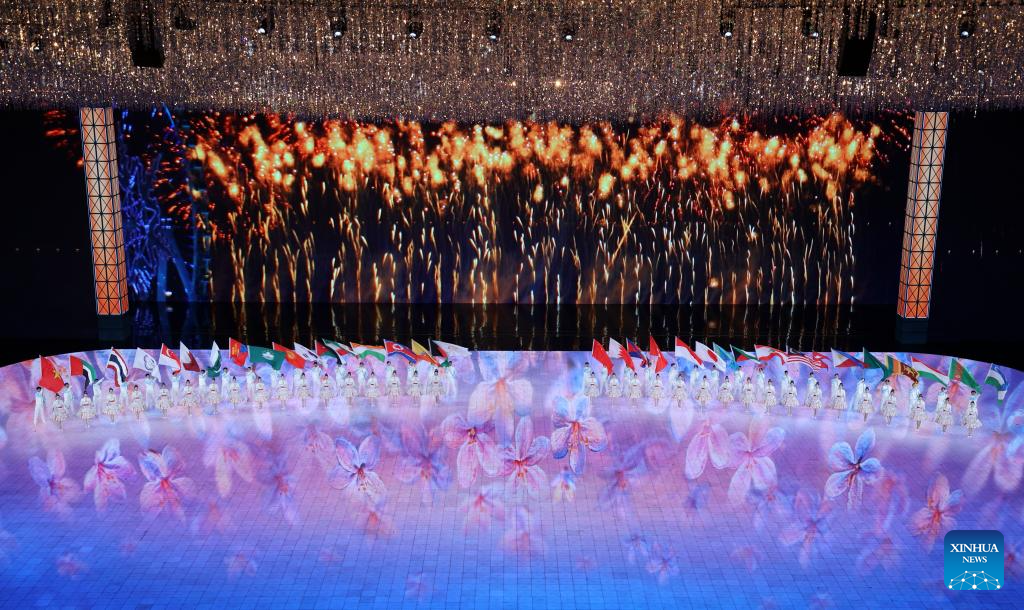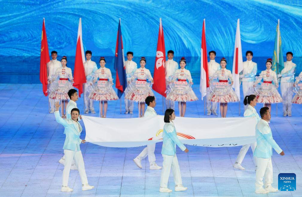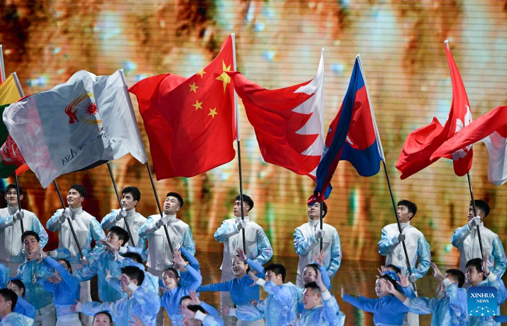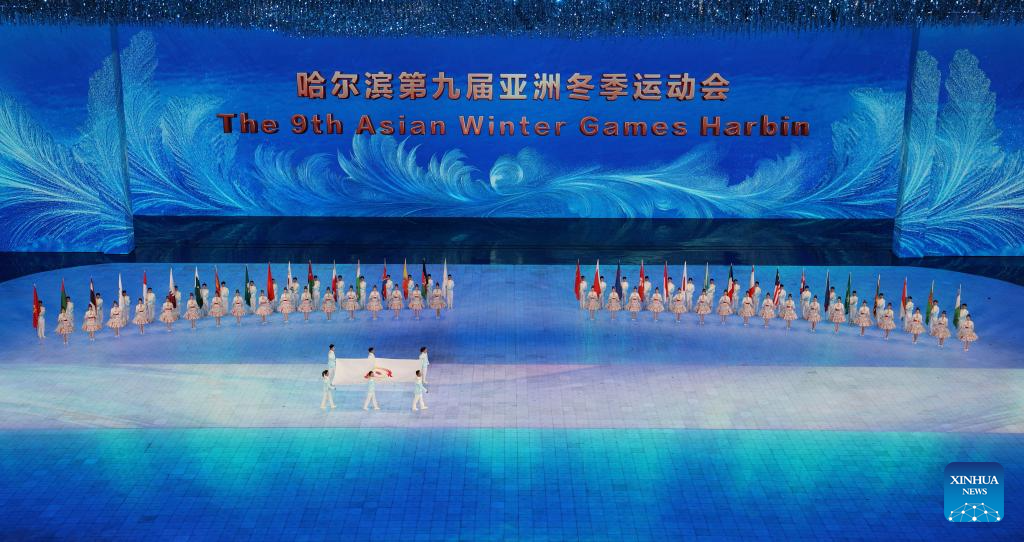 Flagbearers are seen during the opening ceremony of the 9th Asian Winter Games in Harbin, northeast China's Heilongjiang Province, Feb. 7, 2025. (Xinhua/Chen Zhenhai)
