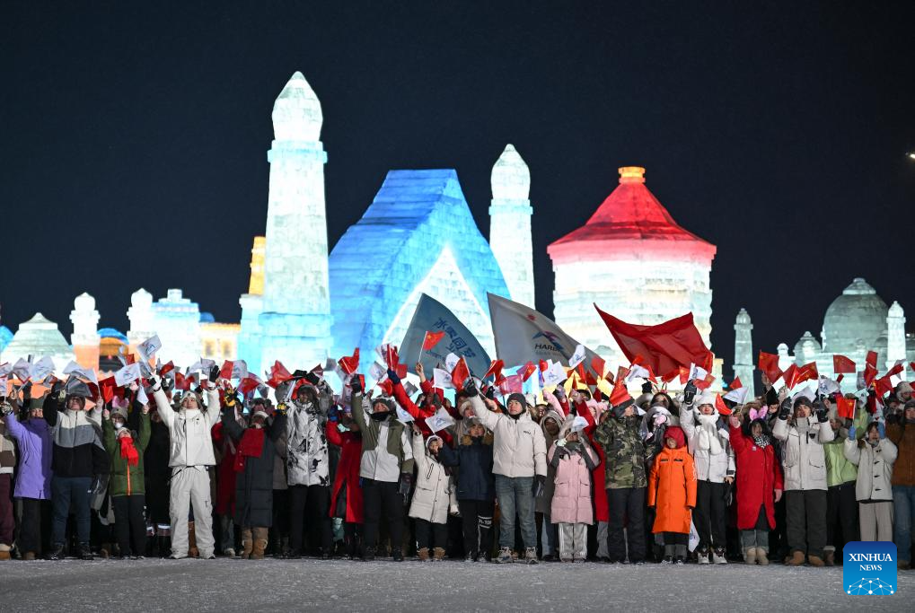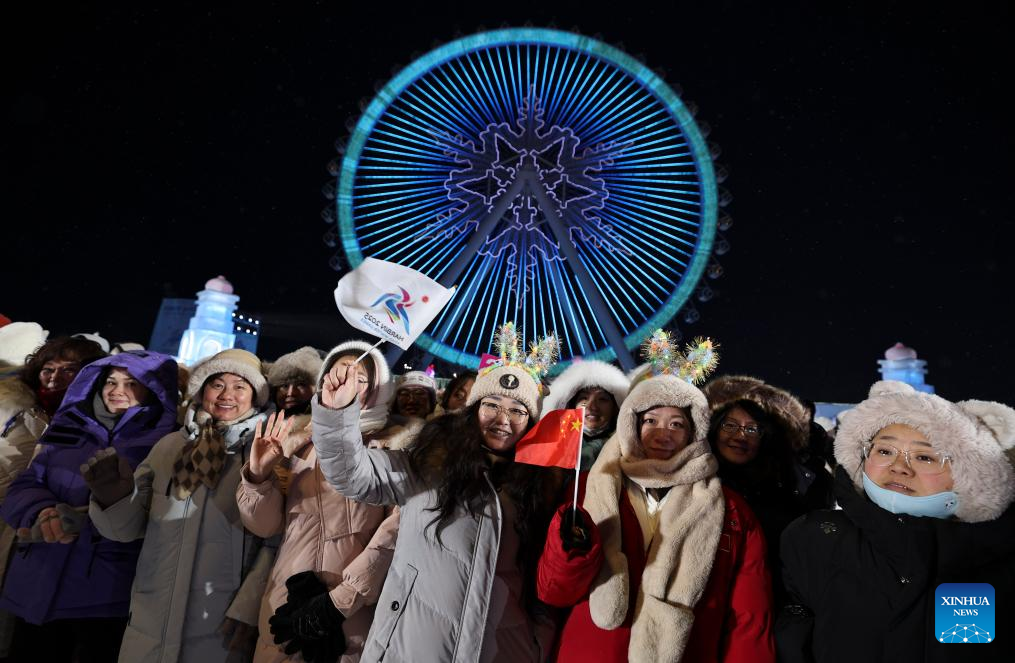 Spectators gather at the Harbin Ice and Snow World Park before the opening ceremony of the 9th Asian Winter Games in Harbin, northeast China's Heilongjiang Province, Feb. 7, 2025. (Xinhua/Zheng Huansong)