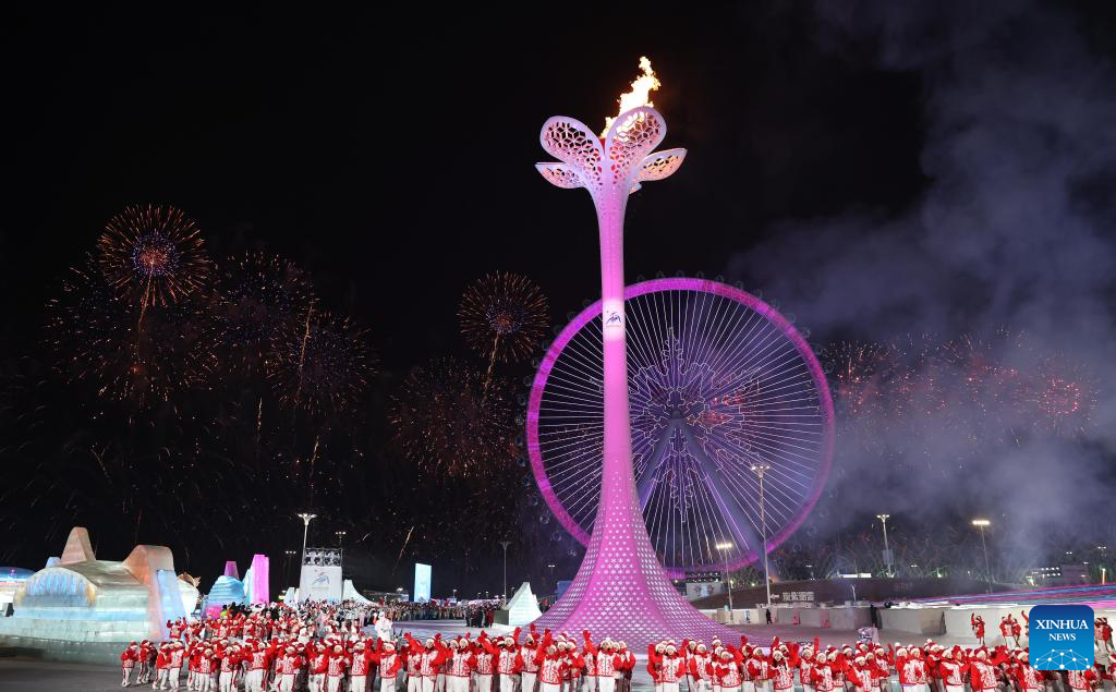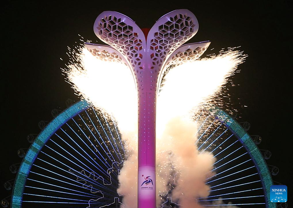 The lit cauldron of the 9th Asian Winter Games is pictured at the Harbin Ice and Snow World Park during the opening ceremony of the 9th Asian Winter Games in Harbin, northeast China's Heilongjiang Province, Feb. 7, 2025. (Xinhua/Zhang Tao)