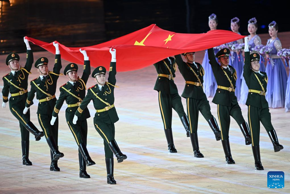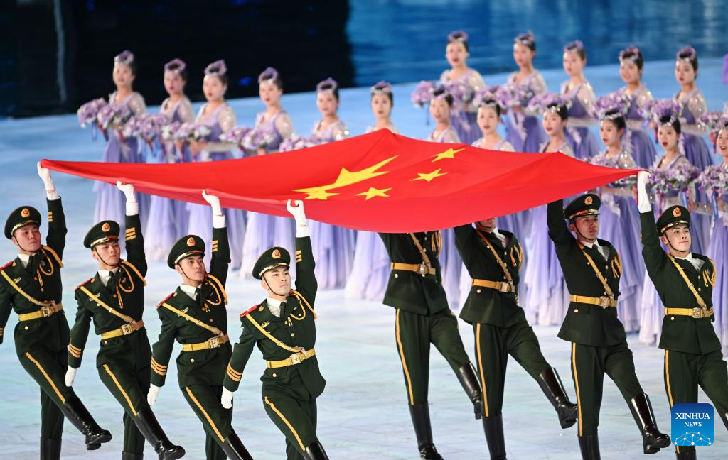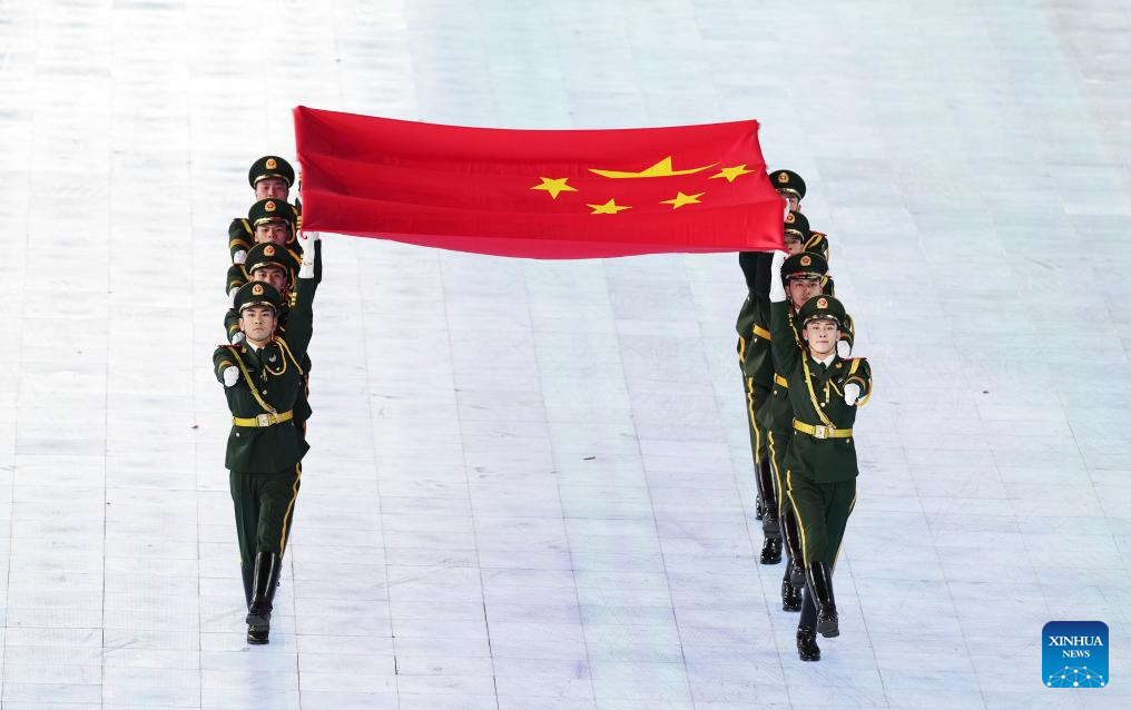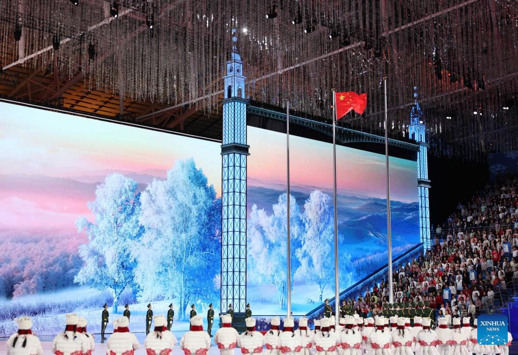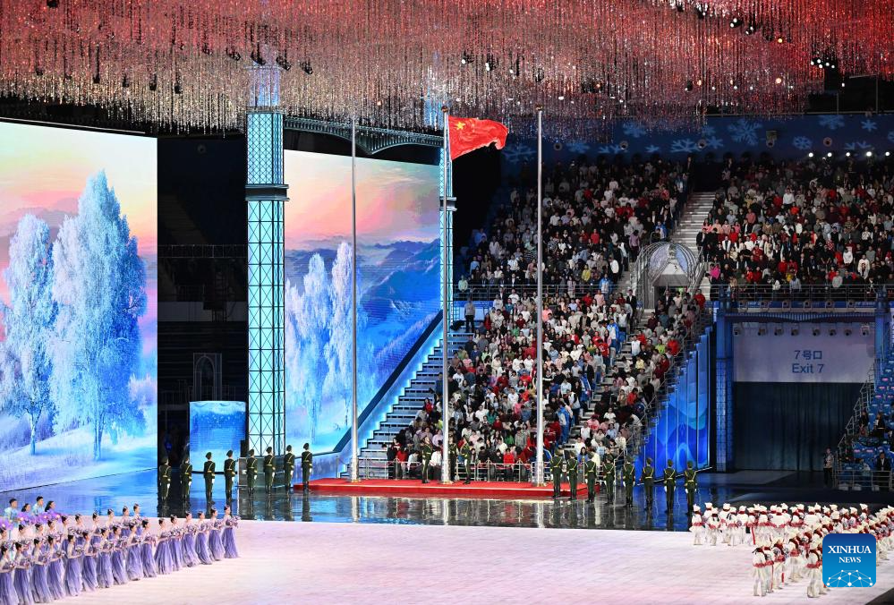 The Chinese national flag is raised during the opening ceremony of the 9th Asian Winter Games in Harbin, northeast China's Heilongjiang Province, Feb. 7, 2025. (Xinhua/Huang Wei)