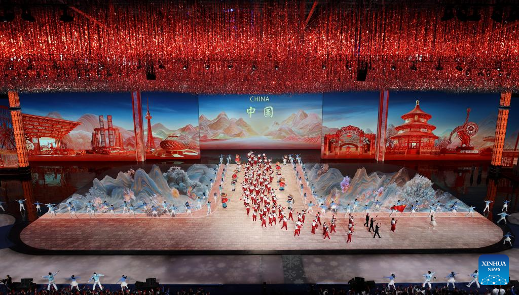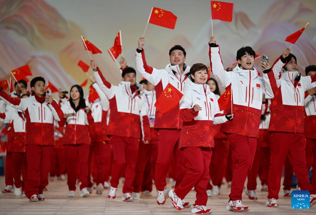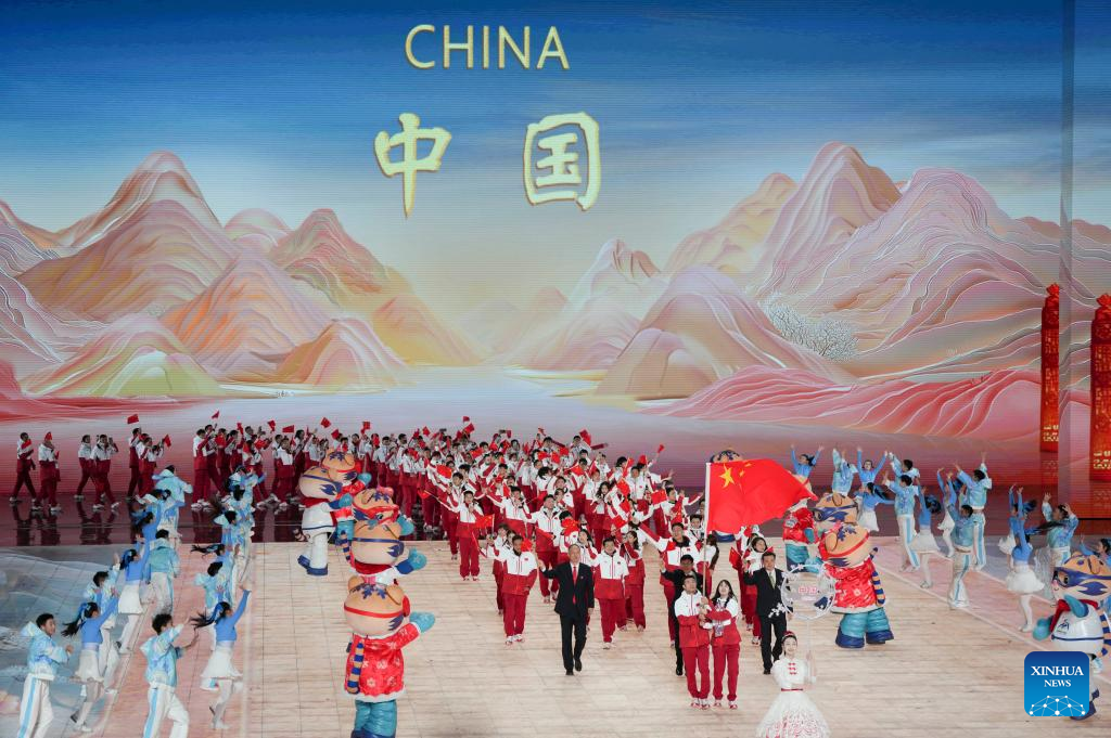 Members of the delegation of China parade during the opening ceremony of the 9th Asian Winter Games in Harbin, northeast China's Heilongjiang Province, Feb. 7, 2025. (Xinhua/Xie Jianfei)