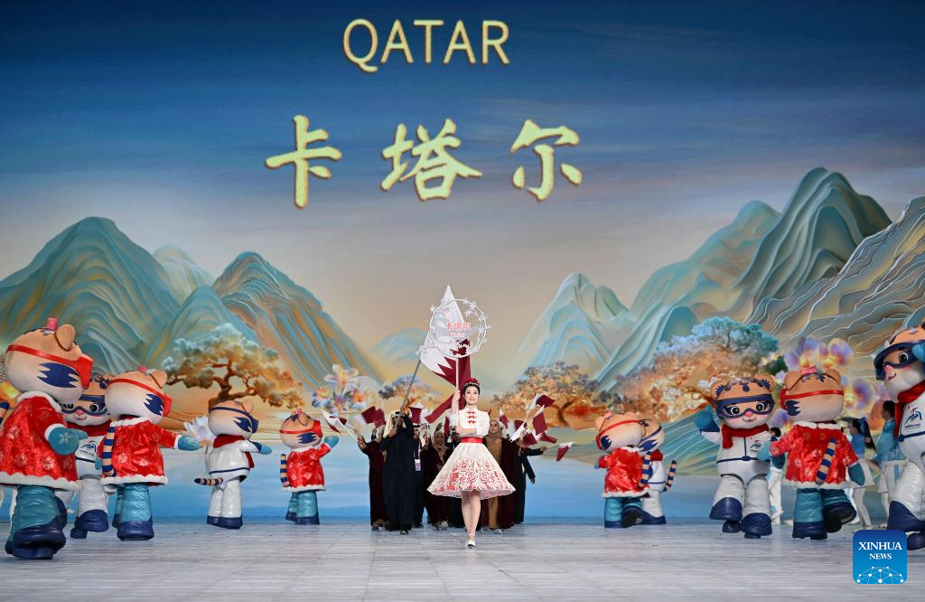 Delegation of Qatar parade during the opening ceremony of the 9th Asian Winter Games in Harbin, northeast China's Heilongjiang Province, Feb. 7, 2025. (Xinhua/Xie Jianfei)