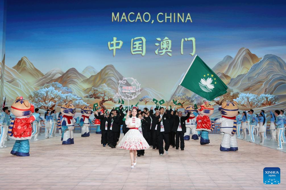 Delegation of China's Macao parade during the opening ceremony of the 9th Asian Winter Games in Harbin, northeast China's Heilongjiang Province, Feb. 7, 2025. (Xinhua/Huang Wei)