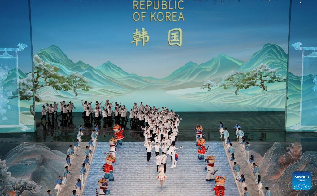 Delegation of South Korea parade during the opening ceremony of the 9th Asian Winter Games in Harbin, northeast China's Heilongjiang Province, Feb. 7, 2025. (Xinhua/Chen Yichen)