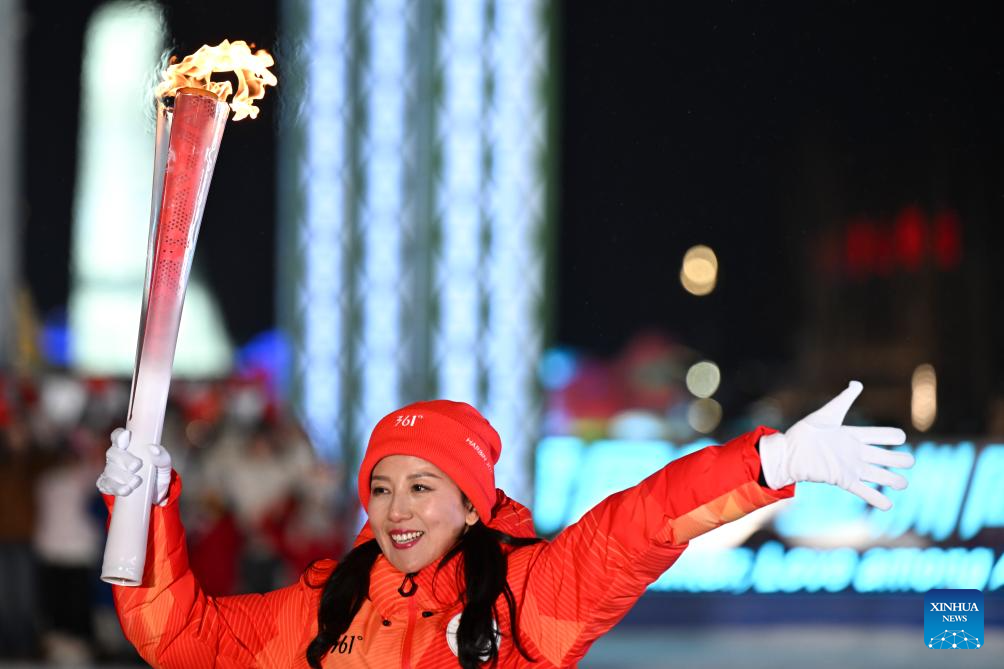 Torch bearer Yang Yang carries the flame at the Harbin Ice and Snow World Park during the opening ceremony of the 9th Asian Winter Games in Harbin, northeast China's Heilongjiang Province, Feb. 7, 2025. (Xinhua/Huang Bohan)