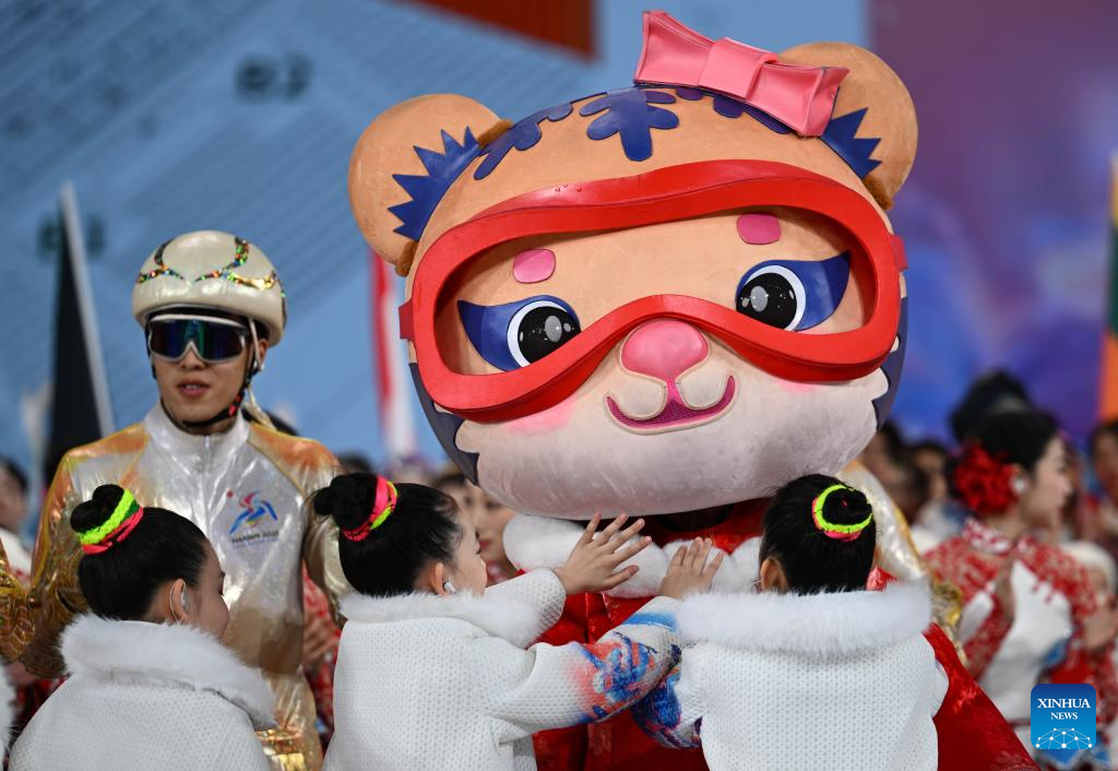 The mascot reacts with children during the opening ceremony of the 9th Asian Winter Games in Harbin, northeast China's Heilongjiang Province, Feb. 7, 2025. (Xinhua/Xie Jianfei)