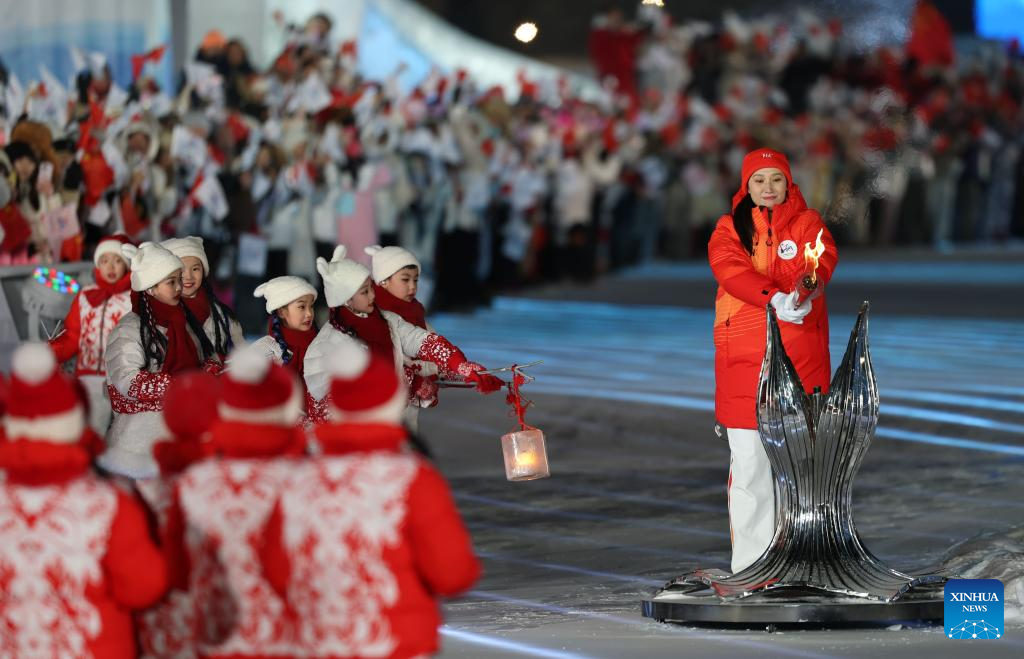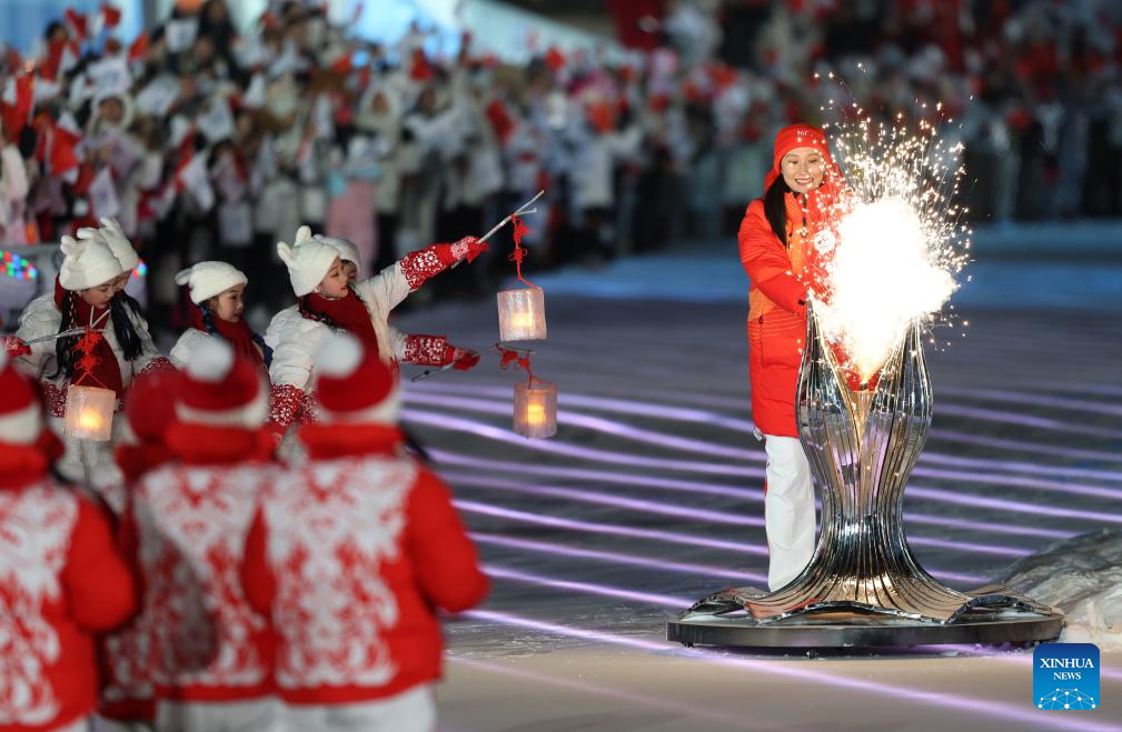 Torch bearer Zhang Hong lights the cauldron at the Harbin Ice and Snow World Park during the opening ceremony of the 9th Asian Winter Games in Harbin, northeast China's Heilongjiang Province, Feb. 7, 2025. (Xinhua/Zhang Tao)