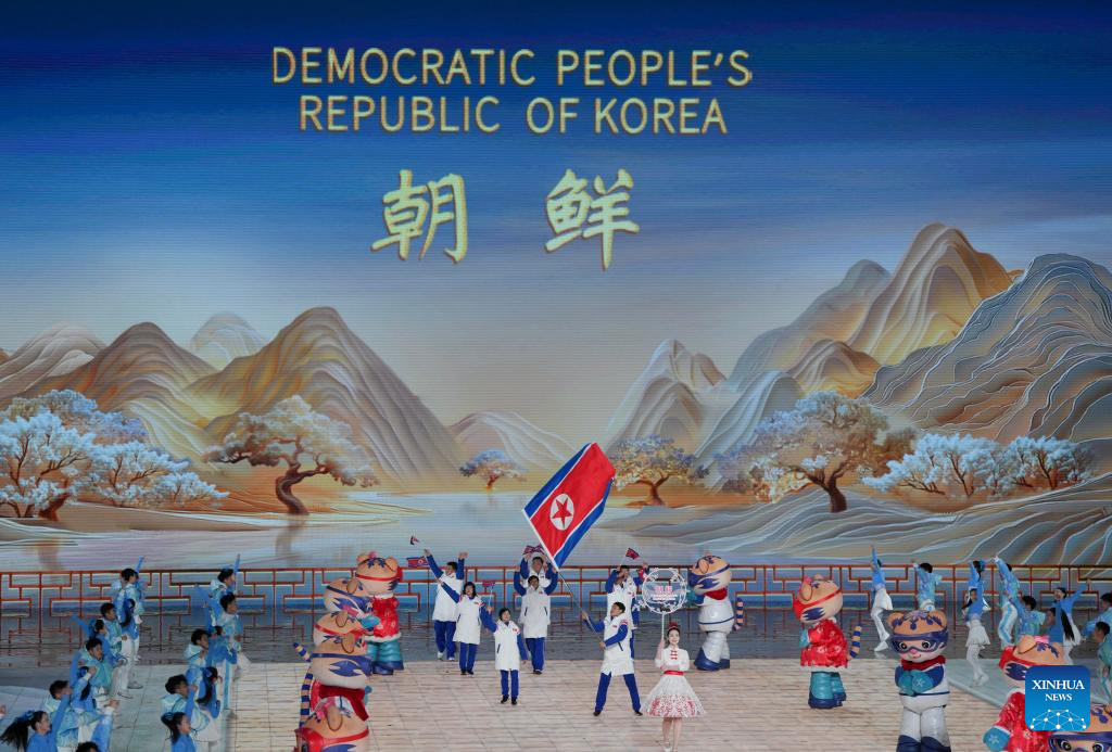 Delegation of the Democratic People's Republic of Korea (DPRK) parade during the opening ceremony of the 9th Asian Winter Games in Harbin, northeast China's Heilongjiang Province, Feb. 7, 2025. (Xinhua/Wang Jianwei)