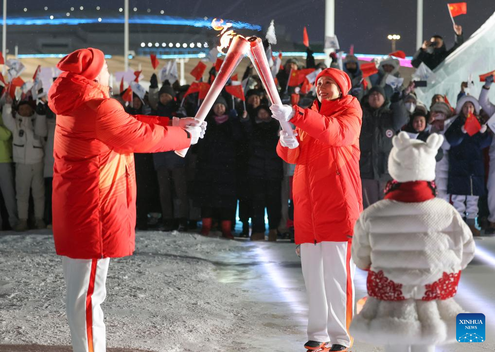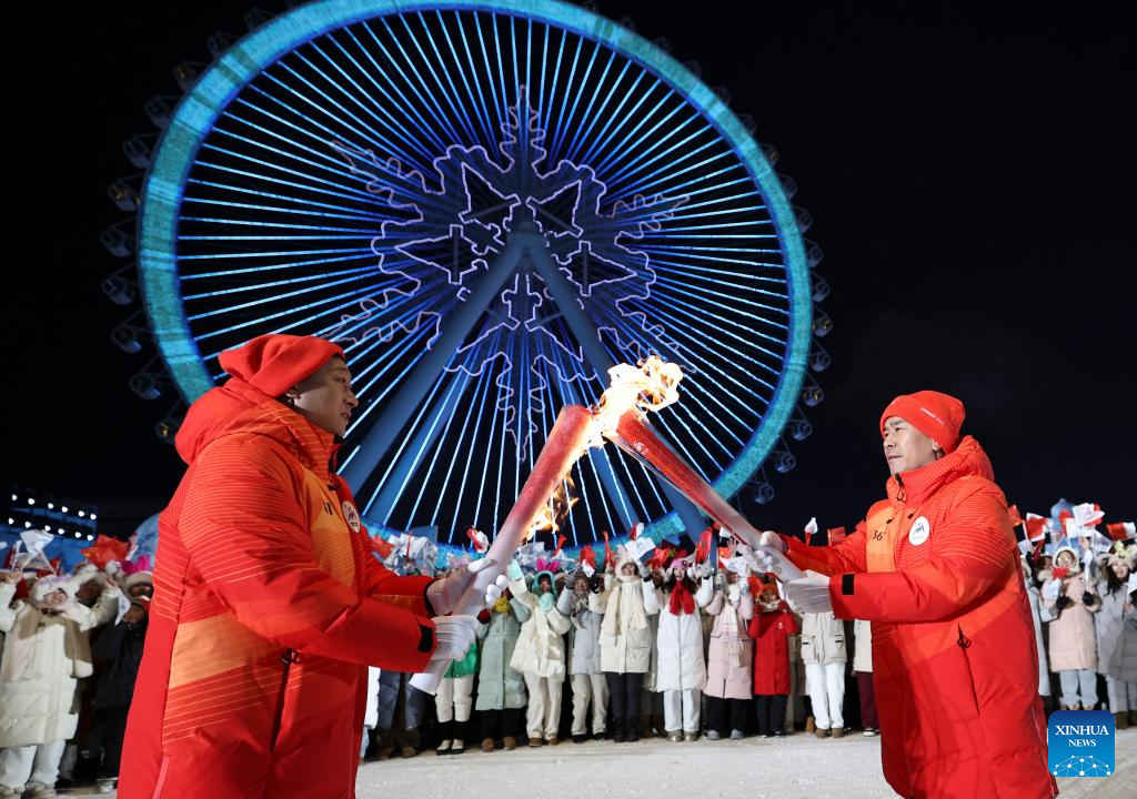Torch bearer Han Xiaopeng (R) passes the flame to Wang Zhen at the Harbin Ice and Snow World Park during the opening ceremony of the 9th Asian Winter Games in Harbin, northeast China's Heilongjiang Province, Feb. 7, 2025. (Xinhua/Zheng Huansong)