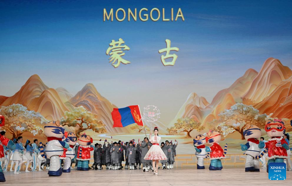 Delegation of Mongolia parade during the opening ceremony of the 9th Asian Winter Games in Harbin, northeast China's Heilongjiang Province, Feb. 7, 2025. (Xinhua/Xie Jianfei)